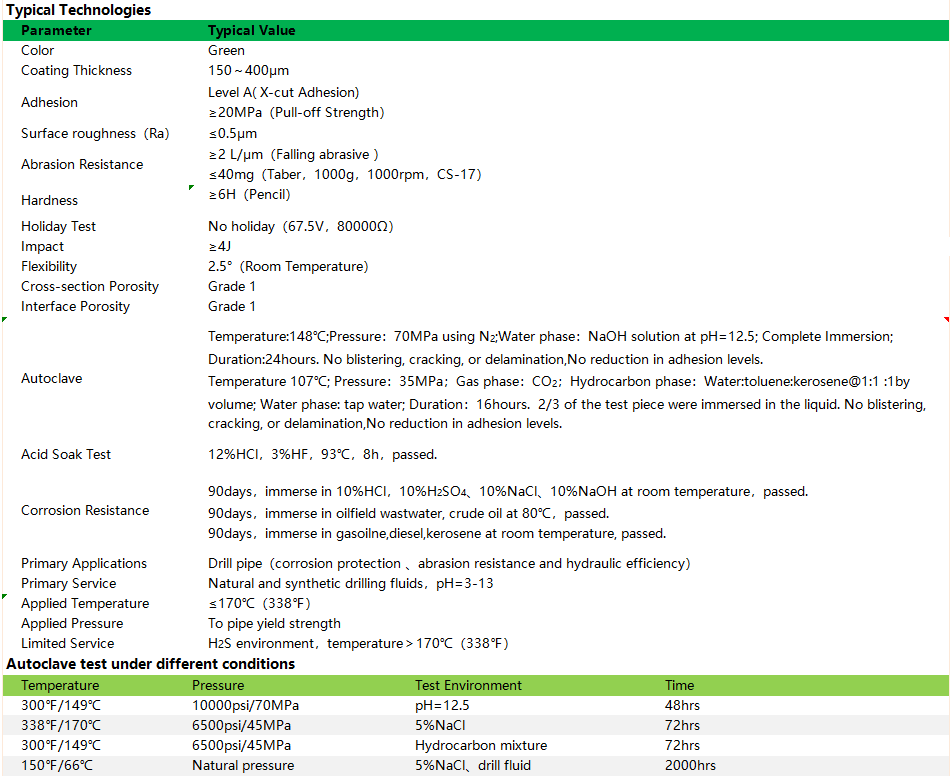 It is a multi-purpose drill pipe internal coating that can be used over a wide temperature and pH range.